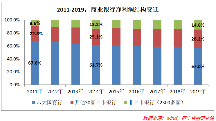 在金融科技大潮下,地方性小银行正加速被时代抛弃。2011-2019年,六大国有银行(工农中建交邮储)净利润占比持续下滑,让出的市场份额,早期是中型和小型银行均沾,但2015年以来,只有30家上市银行吃到了红利,另外约2300多家非上市银行的利润占比趋于停滞,只是喝了口汤。