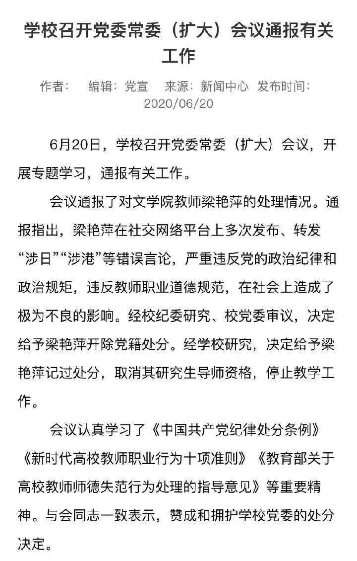 湖北大学中文教授梁艳萍的处理结果出来了,梁艳萍因在社交平台上多次发表“涉日”、“涉港”等言论,被开除党籍、给予记过处分、取消其研究生导师资格,停止教学工作。这个决定虽然是千呼万唤始出来,但我对湖北学校的这个处理结果,还比较满意。