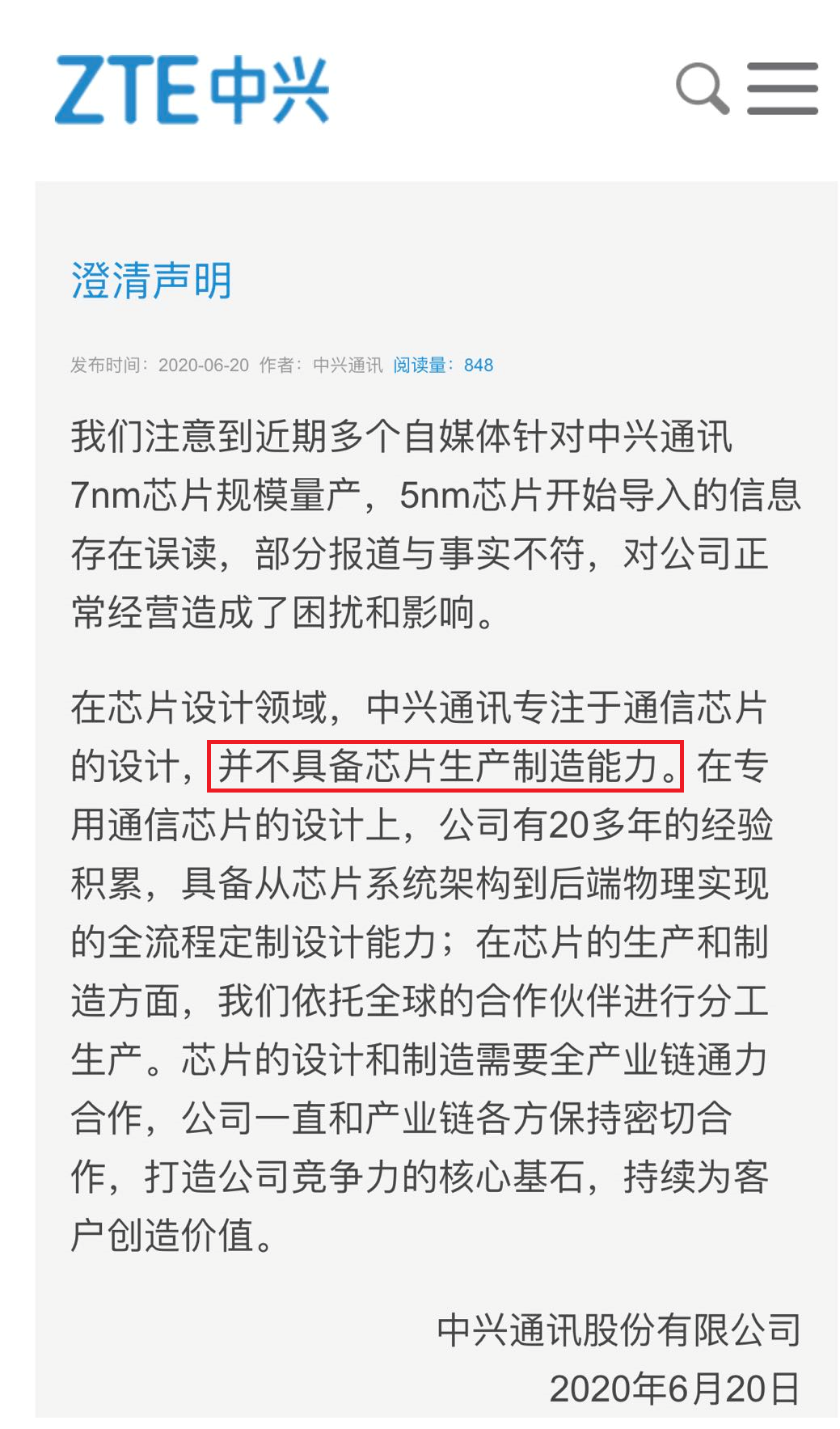 果不其然,6月20日(也就是周六)中兴发布“澄清声明”,其中明确说,“中兴通讯专注于通信芯片的设计,并不具备芯片生产制造能力。”