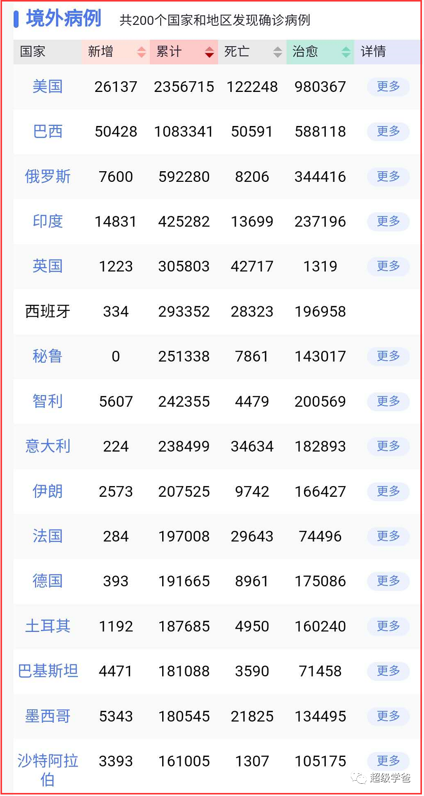 美国的总确诊达到了235万,每日新增确诊又恢复到了三万多的水平。巴西紧随其后,总确诊超过了108万,单日新增在3~5万。