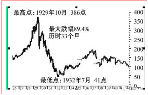 1929年出现的是最大跌幅,随后反弹。然后一路下跌,跌到了1929年10月最高点的10.6%,跌幅89.4%。