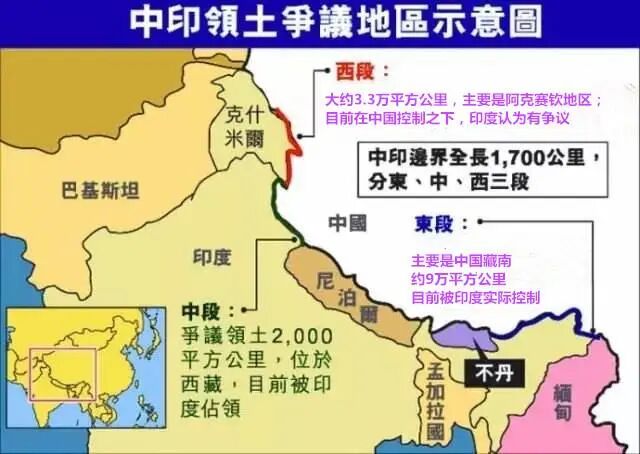 中印两国拥有1700公里的边境线,但两国一直未正式划定边界(印度历史上绝大部分时间支离破碎,想和它们划边界,也找不着主体);按照传统习惯,大体上以喜马拉雅山脉为界,分西段、中段和东段三个地区。