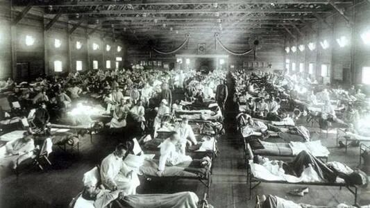 ▲美国堪萨斯的一所野战医院里挤满了患有西班牙流感的军人话题说到这,是要说明瘟疫大流行实际是一种自然现象,一般出现在地球的冷周期中,缘于这时太阳黑子数少,太阳对地球的辐射很弱,具备病毒加速传播的条件。