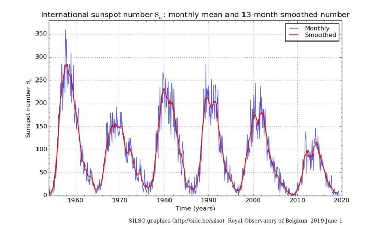 ▲图源:杨学祥教授的博客很多人会说这是生物学家的努力让病毒终止了传播,其实我们知道这是糊弄人的说法。只要病毒的传播超过一定的速度,又没有有效的疫苗,各种手段在阻断病毒传播这个环节上所能起到的作用很小(但这不否定医护部门在拯救生命中的作用)。纽约的统计数据显示,在新冠病毒大流行过程中,居家之人染病的几率比外出工作之人还高,所以从某种角度看,人类使用的物理隔离措施对病毒传播所起到的阻断效应值得商榷的。有人一定会说,或许是外出戴口罩发挥了作用,但如果病毒在空气中广泛存在,口罩并没有多少用处,因为任何人都不可能一天二十四小时都戴着口罩。所以,物理隔离措施对病毒传播的阻断作用是有限的。因此,有效阻止病毒传播的因素很可能与人的行为没有太大的关系,而是客观因素在发挥作用。一般认为是因为冬季前后的紫外线更弱,“放纵”了病毒的传播,而夏季紫外线增强,抑制了病毒的传播,所以,SARS只流行了两个季度就结束了。现在问题来了,既然新冠病毒与SARS病毒有很强的相似性,为何新冠病毒现在依旧在印度、孟加拉国、巴基斯坦等南亚国家加速传播?要知道这些地区已经进入了炎热的夏季。我不排除新冠病毒与SARS病毒在流行能力上的差异造成上述差别,但我却更愿意相信,造成这种差异的根源是2003年与现在相比,太阳处于截然不同的状态。2003年与今年,最大的不同恰恰就是太阳辐射强度出现了很大的差异。下图为过去60多年太阳黑子数的变化图,黑子数高,代表太阳辐射强度高,反之亦然,图来自杨学祥教授的博客:由图中明显可以看到这样的差异,2003年所处的周期,波峰时太阳黑子数明显高于刚刚过去的这个周期(图中波峰的高度大约差了一半),同时,2003年正好在上一个周期中太阳黑子数比较高的时间点,对病毒传播的抑制力很强,夏季当然就更强。而2020年却处于现在这个正在过去的周期中太阳黑子数的波谷(几乎是零)时间点。此时太阳辐射的强度很低,即便夏季也无法阻挡病毒的传播,这是十分合理的解释。