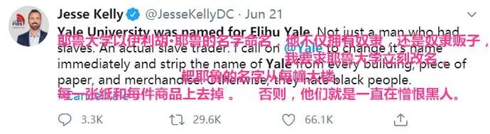 一位名叫Jesse Kelly的右派学者在推特上公开要求耶鲁大学改名,一石激起千层浪。