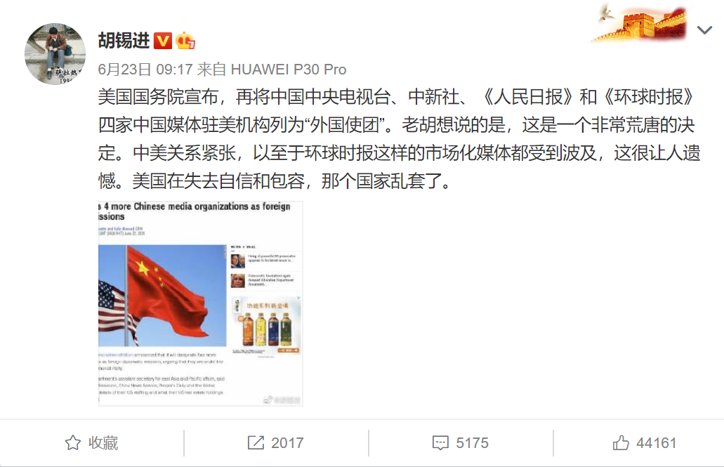 环球时报主编胡锡进说:“这是一个非常荒唐的决定。美国在失去自信和包容,那个国家乱套了。”