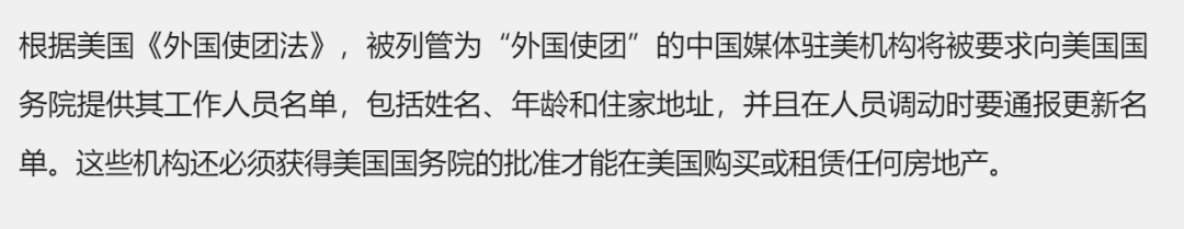 很明显,这是美国为了对中国媒体机构在美国的运营进行限制。
