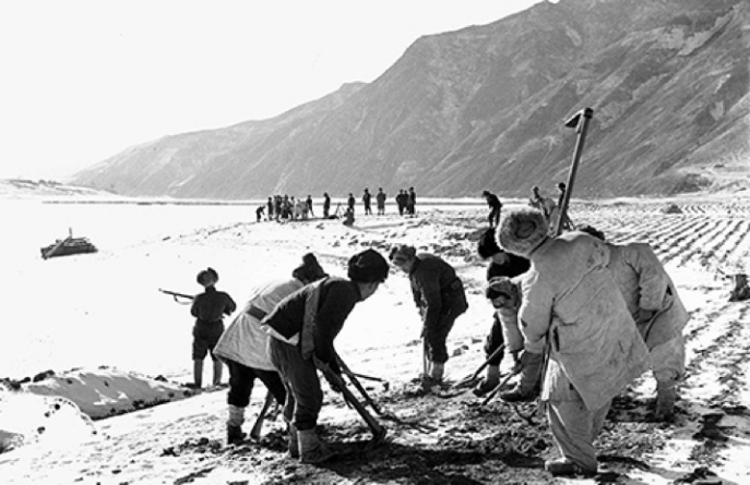 中国和朝鲜的民兵在鸭绿江岸修筑工事,准备迎击侵略者。