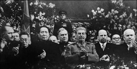 斯大林70寿诞上,毛主席和赫鲁晓夫分别站在斯大林的左右赫鲁晓夫出生于卡利诺夫卡(今属库尔斯克州)的俄罗斯村庄,母亲是一个民间歌女,父亲是一个农民,当然赫鲁晓夫在斯大林晚年一直声称,斯大林是他的“亲生父亲”,但是却在斯大林死后背叛了他。