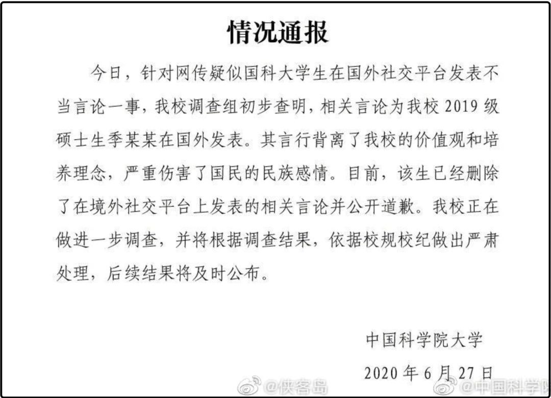 本轮舆论风波发生后,国科大迅速发表声明,于6月27日当天公开表示:该生确系国科大2019级硕士生季某某,目前该生已对不良言论进行删除处理,并已公开道歉。校方将进一步调查,根据相关规定做进一步严肃处理。