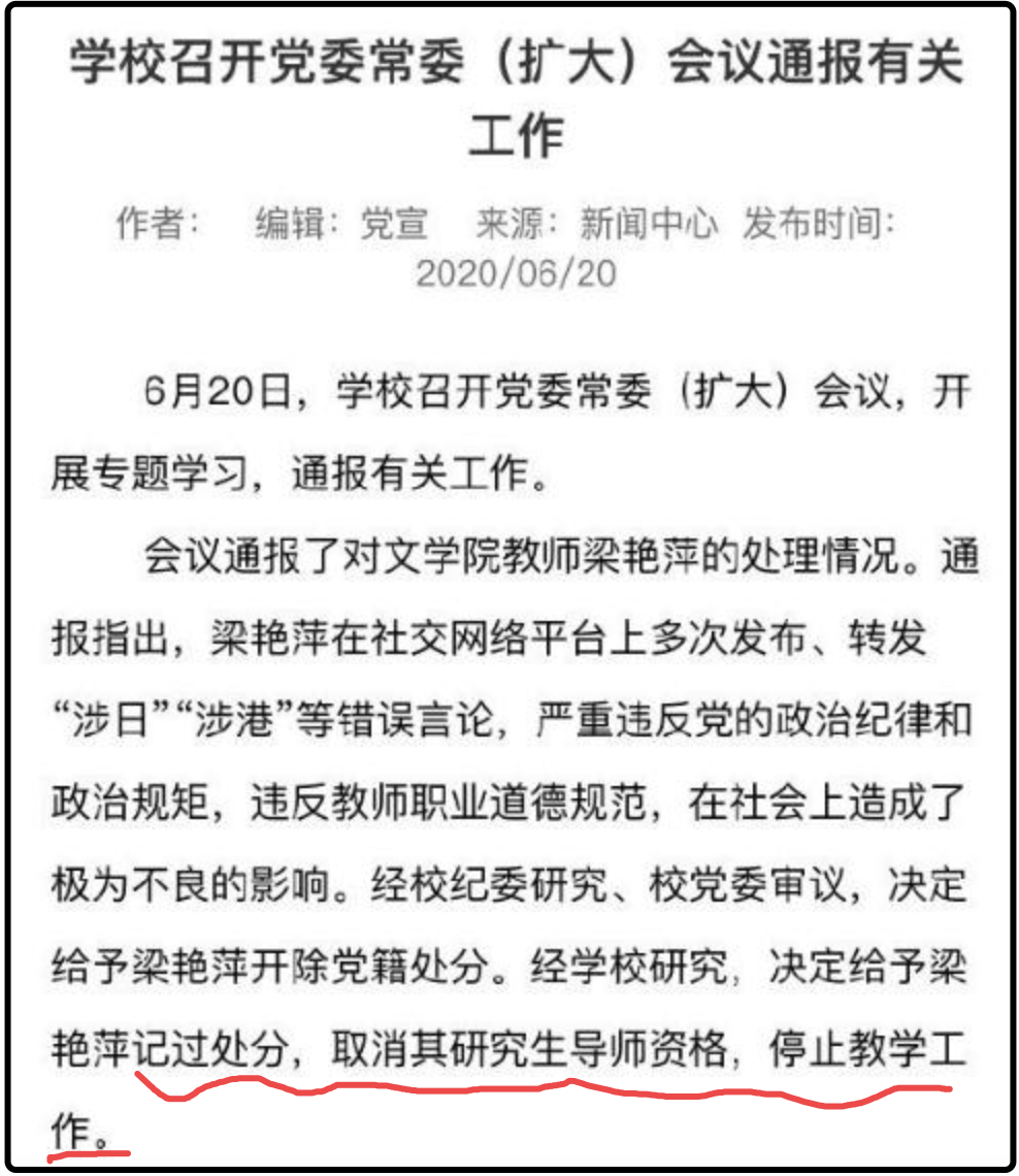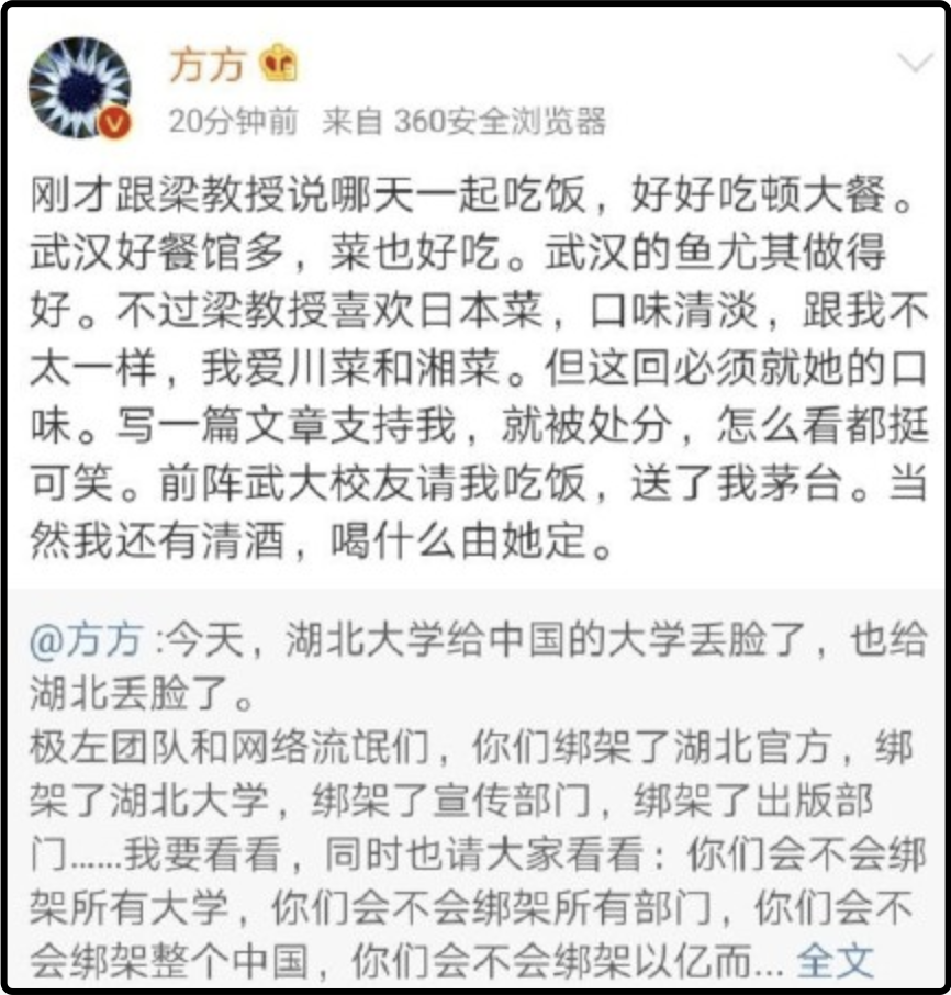 也就是说,其他相应的福利待遇并不变,就是不再从事教学工作了而已。此外,针对网友们曝光的该校其他相关“问题人员”,校方至今依旧只字未提。正如网友们所质疑的那样,这样的处罚看起来显得太“轻描淡写”了,一个公然支持叛国分子的教授、一个公然为日军侵华唱赞歌的教授、一个长期给学生灌输精日思想的教授、一个歌颂法西斯精神的教授、一个学着侵略者高喊同胞是“支那”的教授,居然只是简简单单的“停职”而已。如此宽宏,未免也显得“辱国”成本过于低廉了吧?!低廉得以至于梁艳萍的蜜友方方,在事后仍旧大张旗鼓地秀自己与当事人“不痛不痒”的状态,甚至不忘继续挖苦社会大众、绑架社会良知。
