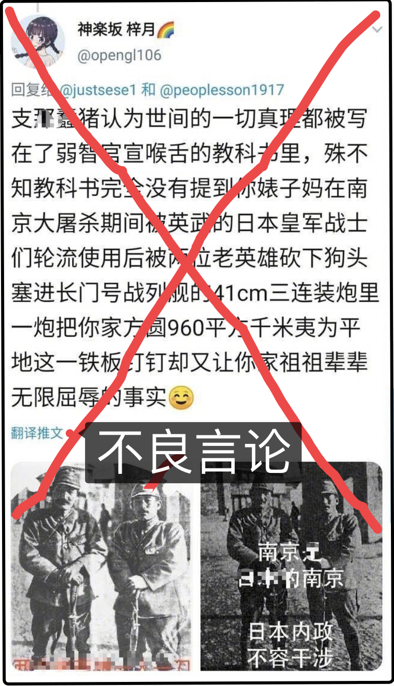 6月20日,该生同样在推特上发布了带有“支那蠢猪”字样的内容,而图文内容中不仅亵渎、攻击南京大屠杀死难同胞,还在配图中配上“南京是日本的南京”、“日本内政不容干涉”的字样,以表达其对日本的崇拜与对中国的不屑。