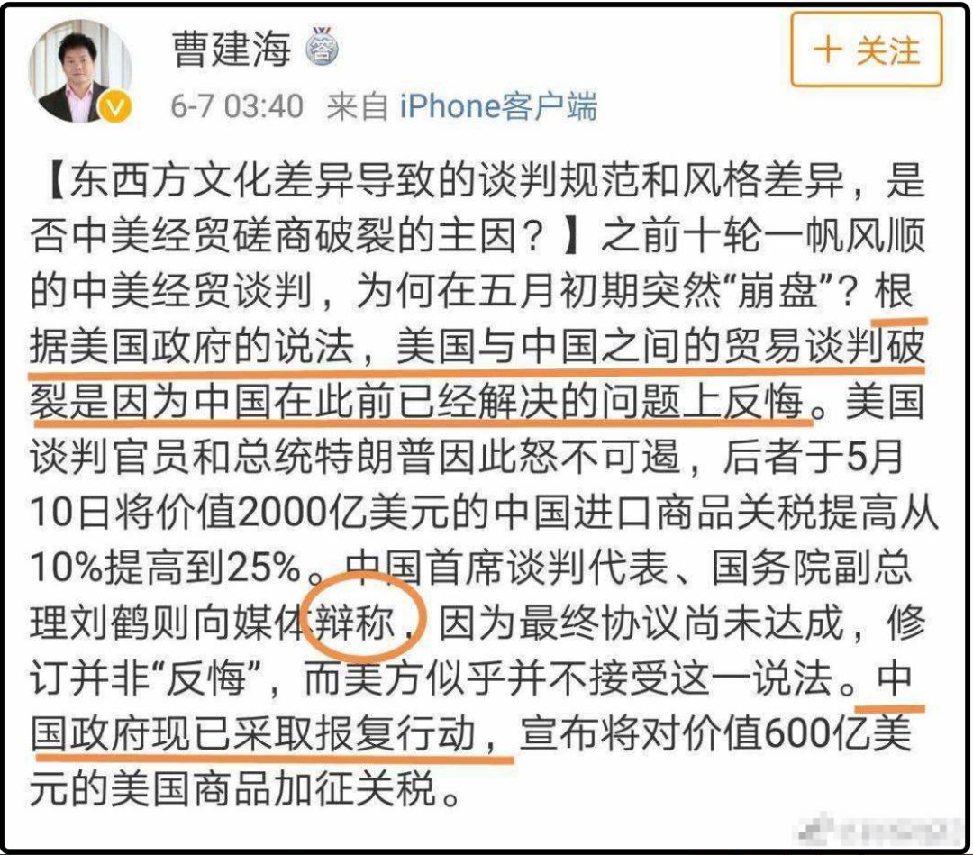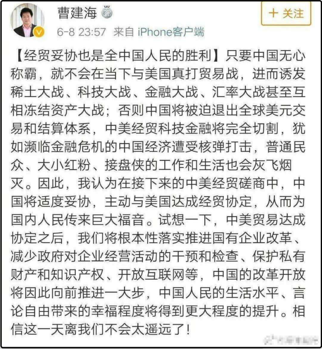 ▲孙立平贸易战期间美化美国、鼓吹投降论的文章部分内容截图。与孙立平“教授”齐头并进鼓吹“投降论”和“美国正义论”的,还有微博认证信息为“社会科学院研究生院教授”的大公知曹建海,在中美贸易战“交锋”期间,曹建海通过微博等网络平台发表大量阴阳怪气的言论,其中不乏鼓吹“投降”的字眼。随后,其账号被微博官方封锁,也仅是账号封锁而已。▲中美贸易战期间,曹建海教授的“投降论”和“中国有罪论”。