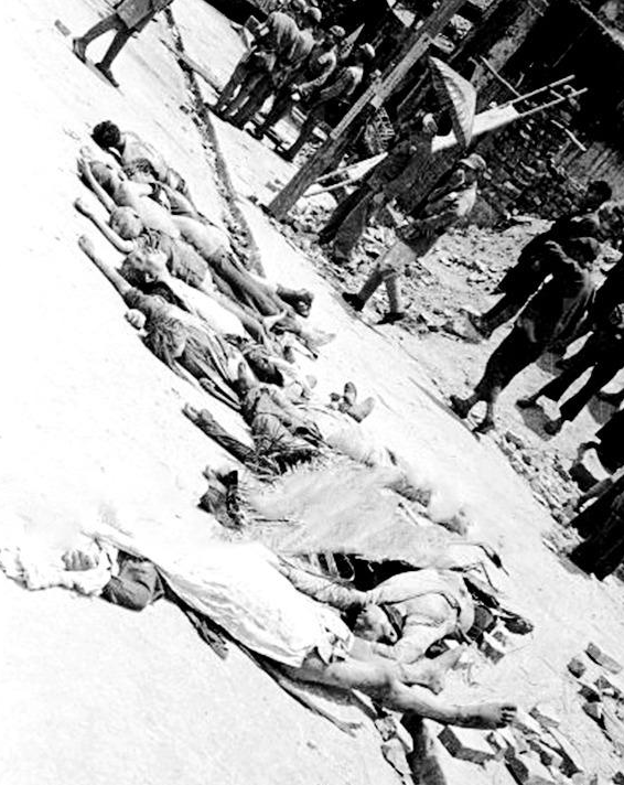 在倒塌废墟外的空道上,摆放着的是一卷破烂的竹席。