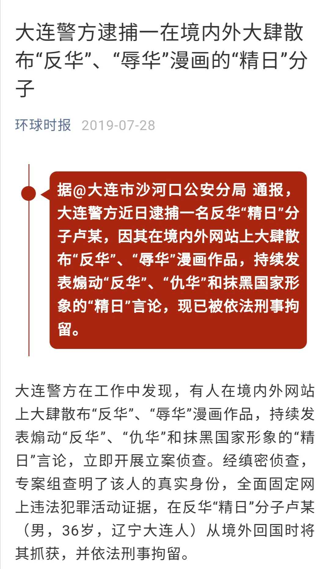 更让人高兴的是,卢某是在境外网站上发表“反中仇华”内容而被捕的,说明我们的网警充分行使了管辖权。