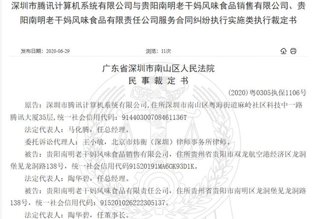 6月30日,中国裁判文书网显示,广东省深圳市南山区人民法院发布一则民事裁定书,同意原告腾讯请求查封、冻结被告老干妈公司公司名下价值人民币16240600元的财产。