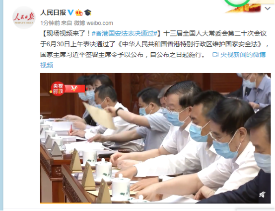 据报道,十三届全国人大常委会第二十次会议于6月30日上午162票全票表决通过了《中华人民共和国香港特别行政区维护国家安全法》。