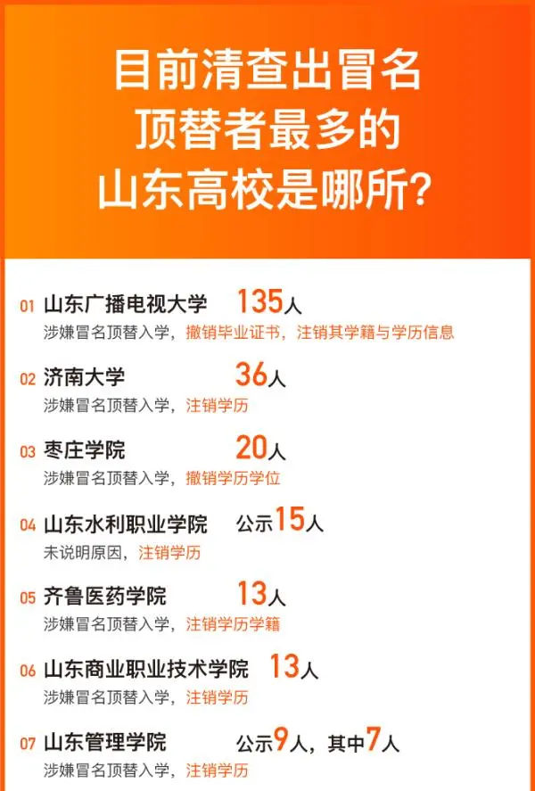 5月底,山东聊城冠县的陈春秀准备报名成人高考时,却发现自己已经获得了山东理工大学的大专文凭。但她在2004年高考后没有等到录取通知书,何来的大学毕业证?山东理工大学很快查出了顶替入学者,并将其学籍注销。6月15日,聊城再曝一起顶替案。王丽丽1996年考取聊城农业学校(中专),但却被顶包。后来因为填写相关信息,假王丽丽只能来找真王丽丽,真相得以曝光。但一波未平一波又起。6月22日,济宁人苟晶向山东省教育厅实名举报,称自己在1997年和1998年山东高考中连续两年被冒名顶替。而这一事件的操作者,竟是苟晶的班主任,顶替者是班主任的女儿,只因为她和苟晶长得很像。更可气的是,2003年苟晶收到班主任托人转交的一封信,班主任亲自承认了自己让女儿冒名顶替苟晶上大学的经过。但事件曝光后,济宁当地多个部门都联系过苟晶,认为她破坏了济宁形象,暗示其删帖,快80岁的班主任甚至亲自跑到杭州堵门施压。船长对这个操作实在太熟悉了,之前写过不少山东的文章,撑不过两天就会404。一系列的顶替高考案件被曝光后,山东不得不全面摸查。结果令人震惊,从2002年至2009年的在读大学生中,一共查出242名冒名顶替者。6月29日,陈春秀、王丽丽两起顶替案的调查结果终于公布。两起顶替案,共处理46人,其中包括中学校长、大学副校长、招生办主任、乡长、派出所民警,甚至邮局的副局长都参与其中。而其中的关键人物——仅仅一个乡长,就能通过关系层层渗透,能量之大,细思极恐。而242名顶替者的背后,还能牵出多少人?这个数字,或许只是冰山一角。从前几年的青岛大虾事件,到去年的山东大学留学生陪读事件,再到如今的合村并居、高考顶替案,社会舆情对山东仿佛从来不会客气。2019年,山东经济增速下滑到5.5%。尤其是2018年的经济普查核算,山东整体GDP下调近万亿,排在全国31省市之首,和广东、江苏的差距越拉越大。若对山东经济做个总结,三个词足以概括:产业落后、反应落后、思维死板。反应落后:几乎错过了整个互联网的快速发展,甚至在抢人政策的出台速度上,也落后江浙一大截;思维死板:政策一刀切的情况大量存在,合村并居只是一个例子而已。