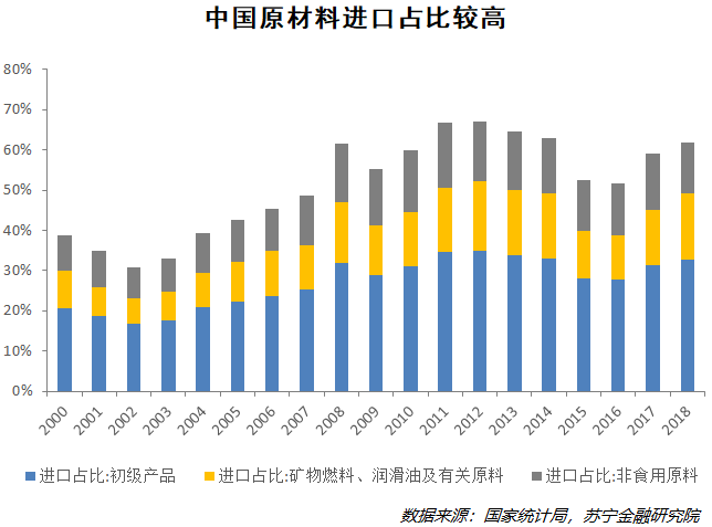 从历年进口数据中可以发现,中国的原料、能源和初级产品的进口规模占比呈现整体升高的趋势,同时中国的大量出口产品都是工业制成品。可见中国的贸易领域对国外上游产品的依赖程度较高,断供导致的中国工业生产“断粮”的风险还是比较高的。