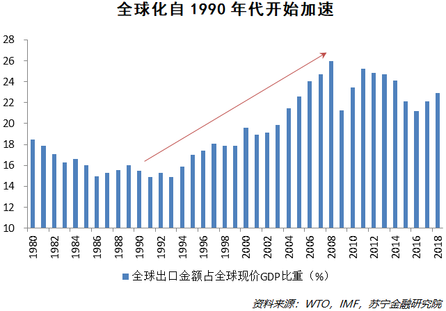 经过了1980年代的滞胀、局部战争后,全球化自1990年代开始发力,一直持续到2008年全球金融危机前。在此期间,全球贸易规模占全球经济总量的比重从不到15%上升到将近26%。