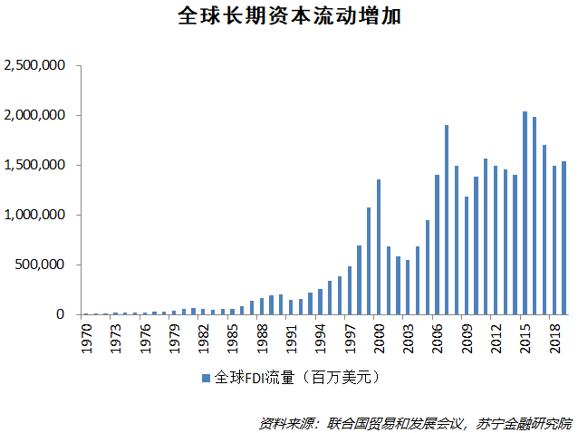 与国际贸易相似,1990年代以来全球各国对外直接投资规模日益增加,尽管受到互联网泡沫破裂、911事件、全球金融危机等事件影响,但资本流动增加的大趋势并未改变。