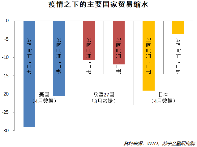 疫情下,全球多地生产活动停滞,对贸易造成了直接打击。3月份以来,失业增加、收入减少和生产活动暂停导致美国和欧盟的贸易明显缩水。即使是疫情防控工作做得比较好的日本,也经历了比较明显的下滑。