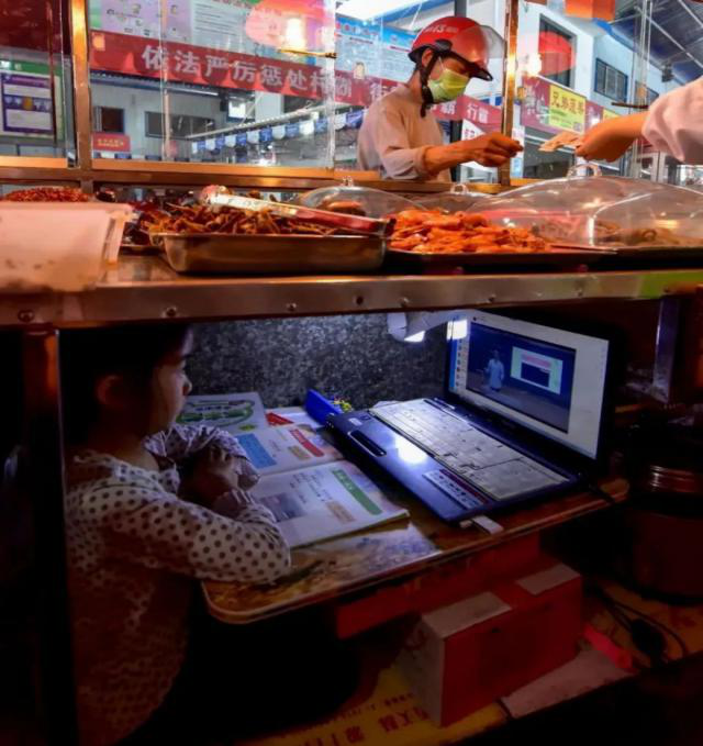 年幼的女儿蜷缩在案板下的一方天地里,安静地上着网课。