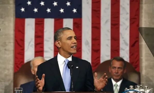 当地时间2014年1月28日晚上,时任美国总统奥巴马在国会发表年度国情咨文,其在演讲中再次提到“亚太再平衡策略”。(图片来源:中国日报)