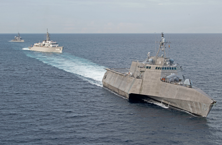 美国海军“吉福兹”号濒海战斗舰与日本自卫队训练舰在南海演习(图片来源:环球网)