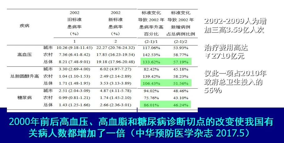 历史上高血压的诊断切点已经下移了四五次了,每次都会人为地增加一大批高血压病人。好多人说,标准改变之前我的血压正常,改切点后一夜之间就成了高血压。我们的一项研究显示,2000年前后国际“三高”(高血压、高血脂、高血糖)症诊断切点改了之后,我国“三高”病人数增加了一倍,仅新增就高达3.59亿人,如果都用药物治疗,总费用可高达2700亿元,占2010年我国政府卫生总投入的56%。