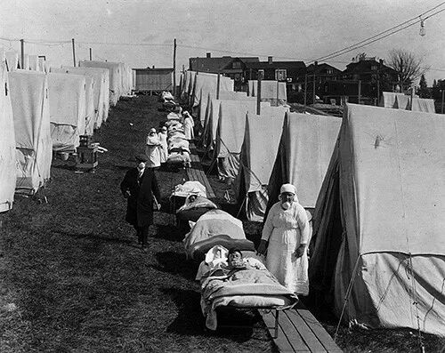 1918年10月,西班牙流感大流行期间,美国马萨诸塞州布鲁克林搭建的帐篷急诊医院挤满病人。