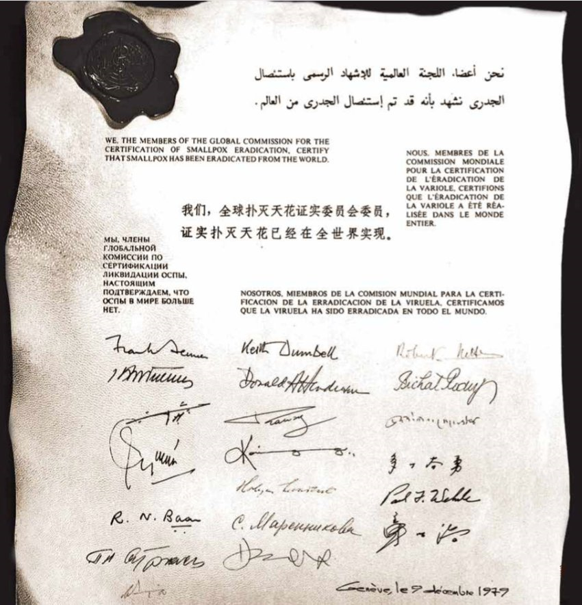 从十八世纪末爱德华琴纳推广牛痘种植法开始,疫苗就是人类对抗传染病最重要的武器,甚至并不需要增加之一这个修饰性的词语,依靠着预防接种,人类减少了数以亿计的死亡,一个又一个的传染病得到了限制。而这个技术的高光时刻在1979年12月9日,科学家宣布消灭了天花病毒,这可能是人类历史最为高光的几个时刻之一,人类依靠着科学的力量和完善的组织,消灭了一种可能总共杀死了接近十亿人的超级传染病,从那个时候去看,似乎传染病这个人类历史最大的敌人之一,已经不再是挑战了。
