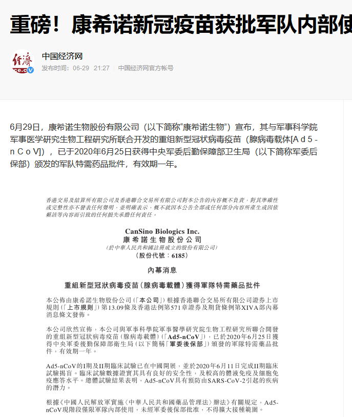 而到了最近一段时间,我国疫苗的研究也确实出现了不少突破,5月22日,陈薇院士团队在《柳叶刀》杂志上面发表了关于疫苗一期实验的具体数据,证明疫苗的安全性是有保障的,有效率也值得期待;6月16日,国药集团宣布他们开发的疫苗在I/II期实验之中,中和抗体阳转率为百分之百,并且有良好的安全性。6月29日,康希诺生物股份公司)公告披露,重组新型冠状病毒疫苗(腺病毒载体)获得军队特需药品批件。同时,全世界有十多种新冠疫苗也在紧张研发中,这样的好消息让大家畅想,似乎疫苗很快就可以解决新冠病毒的问题,全世界很快就可以回到过去正常的生活之中——只是事情并没有那么简单。