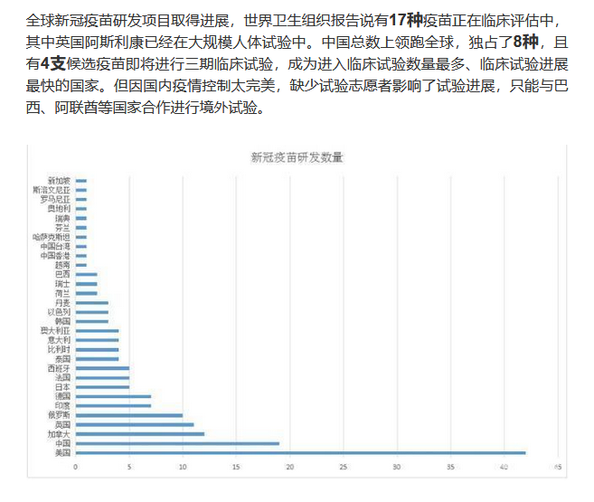 虽然在这次的疫情之中,各国科学界的表现确实都还算是不错,基本上尊重了科学精神,没有受到太多民粹因素的影响,但是大规模的临床试验上,政治干预的余地是很大的。在西方各国疫情依然没有足够控制,而经济陷入困境的情况下,转嫁矛盾几乎是必然的选择,试验受到干扰的概率是不小的;其次,这样大规模的海外试验,我国的医药企业几乎没有进行过,这几年随着制药工业的发展,我国药企在海外进行的实验并不少,但是这些实验的规模基本上在几十人到两三百人这个水平,一般来说这个数量级就足以完成实验了。但是疫苗因为它的特殊性,三期实验规模可能要到几千人甚至上万人,这样的实验规模要在短时间内完成,显然需要很强的项目管理能力,这对于我国科学家和医药企业来说,显然又是一个挑战。