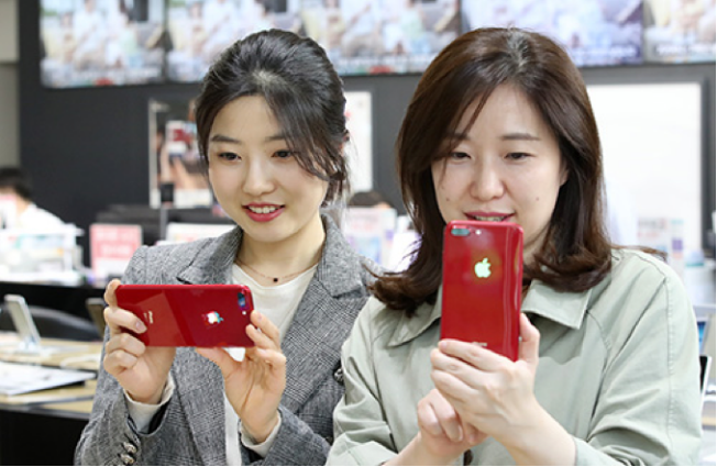 图为两名手机用户在查看iPhone8红色特别版。