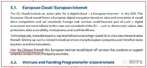 而欧洲,今年才反应过来。最近欧盟出具了一则报告,分析未来互联网(数字服务)的发展趋势,还说要学习中国建墙(like the Chinese firewall)。
