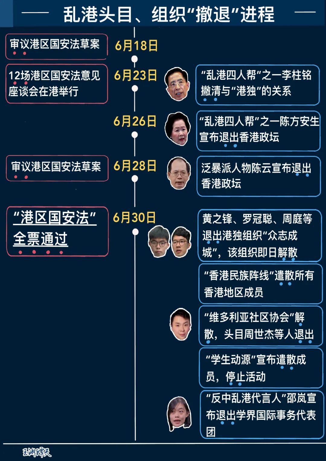 在宣布港区国安法立法后,“乱港圈子”开始了“逃跑潮”。在6月30日国安法通过当天,这个“逃跑潮”达到了顶峰,至少有4个青年为主的乱港组织宣布解散。