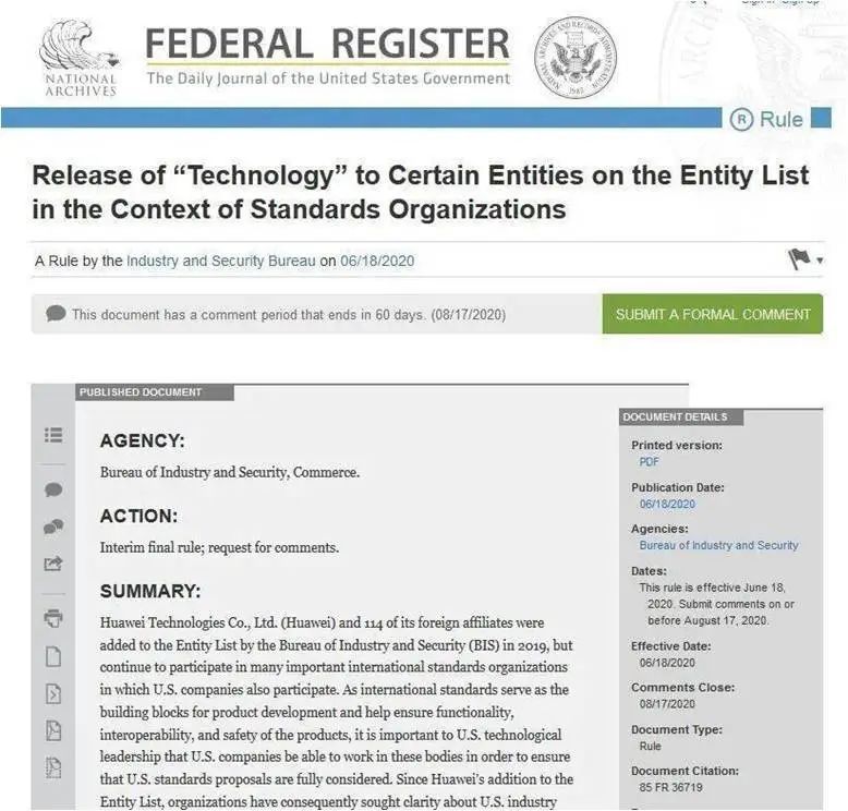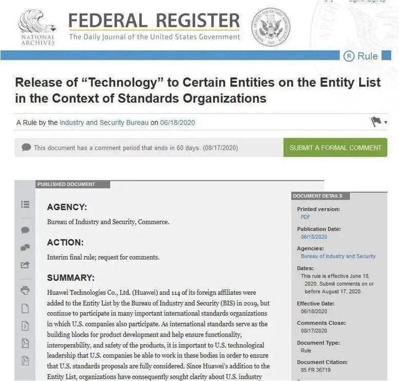 就在6月19日,美国商务部BIS对《出口管理条例》EAR进行了修正,“实体清单”中由华为组织制定与建立5G应用标准有关的技术将附加许可要求排除在外。新规下,美企在特定场景就可以直接和华为披露、讨论相关技术细节,不再需要先向美国政府申报。