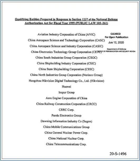 而这显然是一个组合拳。就在此前6月25日,美国国防部公布了一个名单,将包括华为、浪潮、海康威视、中航等20家中国顶尖企业列为中国军方“拥有或控制”。这意味着,这些企业可以随时被总统进行制裁。这一名单由美国国防部起草,已被提交至国会。