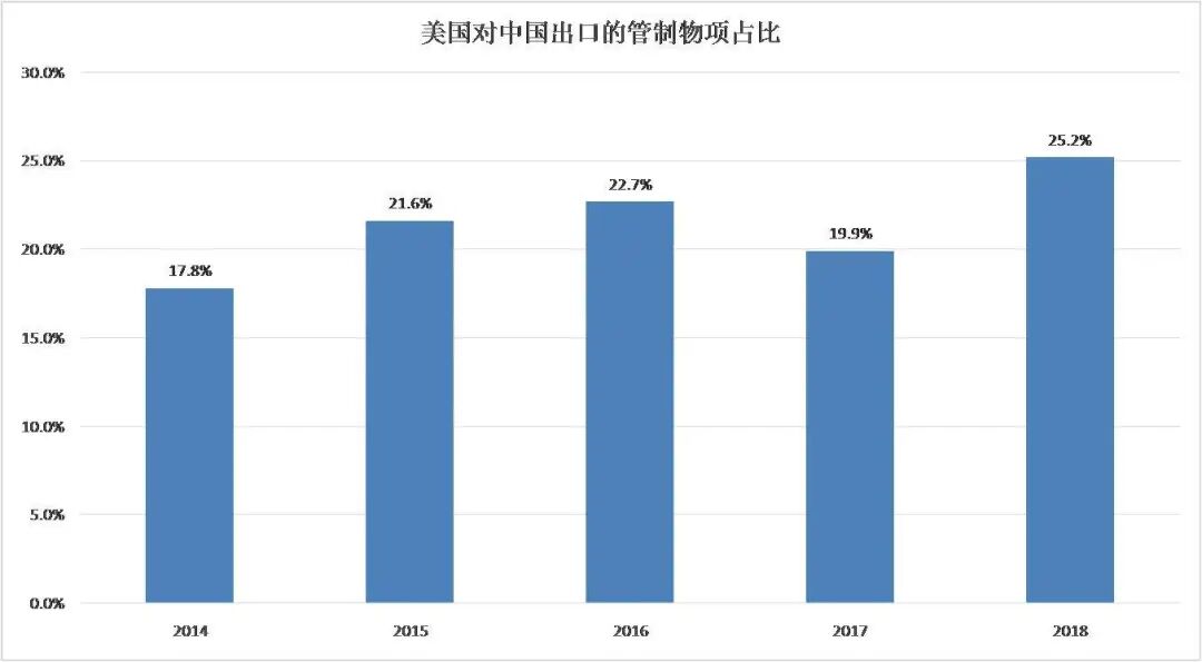 自从特朗普上台,BIS开始空前地活跃。中国则成为其高度关照对象。2018年随着中美经贸摩擦的急剧升级,出口管制物项相对2017年大幅度提升近6个点,达到了惊人的25%。也就是说,美国出口中国的25%产品,都在这个狙击手的瞄准镜之中。