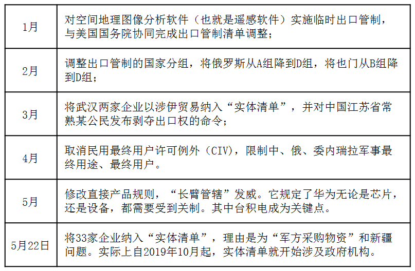 其中2019年5月16日,BIS将华为及其分布在全球26个国家(地区)的68家子公司纳入实体清单。最为国际化的企业——华为入列,引发了轩然大波。多年来行之有效偶见波浪的全球化分工,至此呈现了明显的逆流分界点。