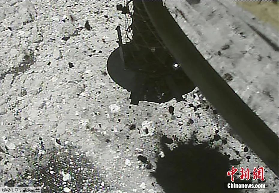 资料图:2019年3月,日本宇宙航空研究开发机构公布隼鸟2号探测器着陆小行星“龙宫”和采集样品的画面。图为隼鸟2号探测器向“龙宫”表面发射子弹,以搜集小行星岩石和沙尘。