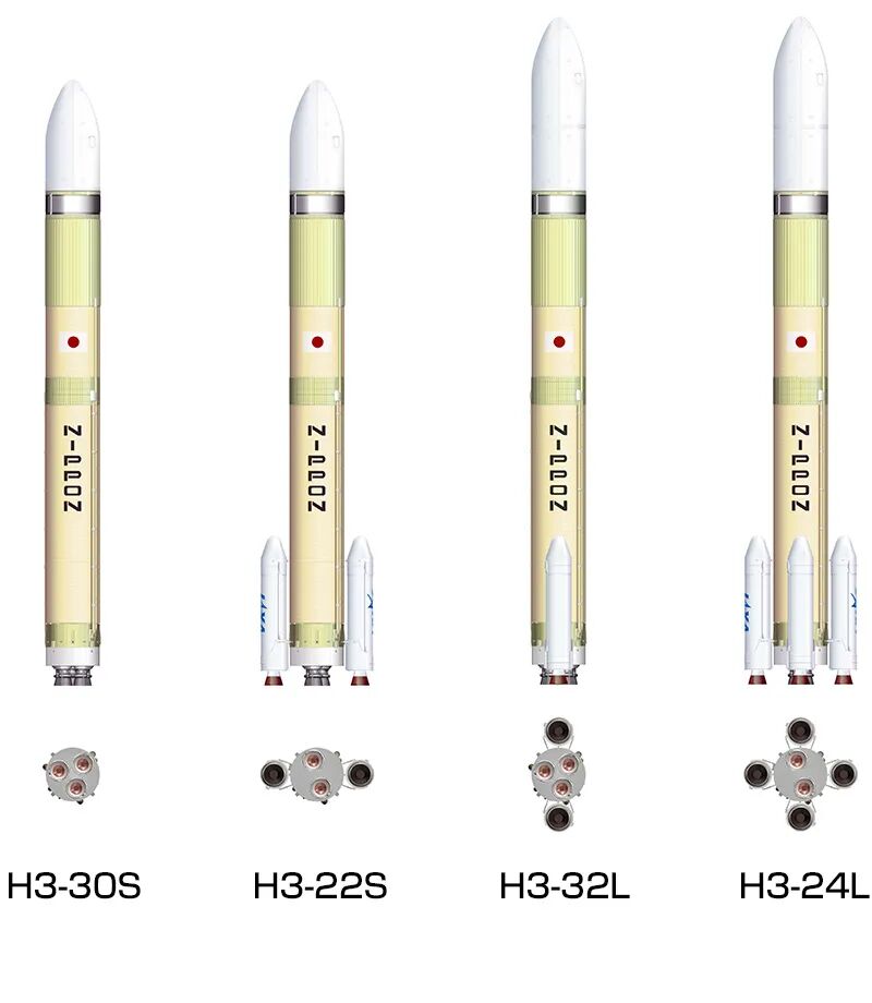 日本新一代H3火箭全长63米,计划于2020年进行试验性发射。通过对整流罩种类、1级发动机和固体火箭推进器个数的切换组装,H3火箭能发射多种不同尺寸和轨道的卫星。图为H3火箭的多种组合形式。(图片来源:JAXA官网)