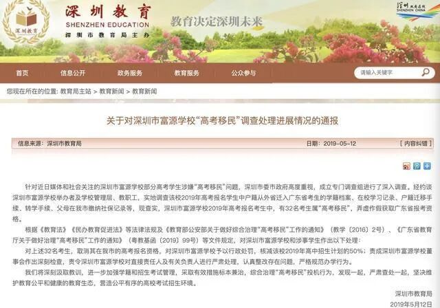 中国青年报中青线记者采访调查发现,富源学校出现多位高考移民,他们都来自河北衡水。 家长们沸腾了,不依不饶,最后的处理结果是:取消32名考生在深圳市的高考报名资格,核减富源学校2019年高中招生计划的50%。深圳高中生是如何进入高中的?说出来都是泪:2019年,深圳参加中考的78300名考生中,被公办高中录取的比例仅为45.38%,对比上一年进一步降低。同年,北京公办普高录取率高达85%以上。只有不到一半的深圳孩子可以进普通高中,在高考这个口子上居然还有人用“高考移民”来抢深圳孩子读大学的机会,确实欠揍,该收拾。是的,深圳正在采取措施增加高中学位,但是过去的十年、二十年在干嘛?为什么到现在才想起来?不但高中学位缺乏,初中、小学的学位也是紧张到无以复加。深圳有多少常住人口?官方在2018年公布的数据是1302万,有多少中小学生?2020年是147万,但中小学的数量只有734个。北京、上海的常住人口过了2000万,在中小学的绝对数量上是深圳没法比的,但是常住人口只比深圳多100多万的广州,中小学的数量比深圳多1倍,即1492所。 深圳每个学校容纳学生的平均数居然是广州的一倍,是北京、上海的一倍还不止,深圳中小学里面的人员密度是不是太大了?
