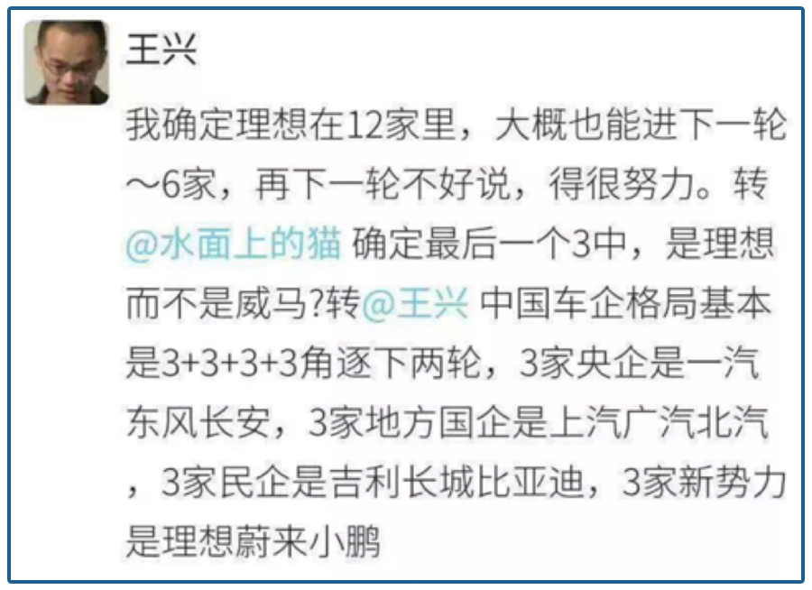 就像美团王兴说的那样,现在中国的车企格局基本是3+3+3+3角逐下两轮了,3家央企、3家地方国企、3家(传统)民企、以及有限的3家造车新势力。