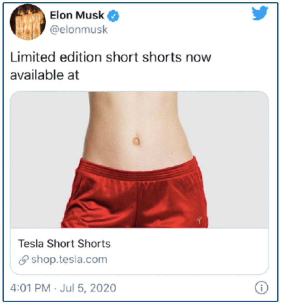 为了庆祝自己战胜了做空特斯拉的“邪恶势力”,马斯克甚至在自家网店上架了一款金边亮红色缎面的限量款“做空短裤”,算是用最直接的肢体语言对空头们说出了那句著名的国骂“Kiss my ass”。