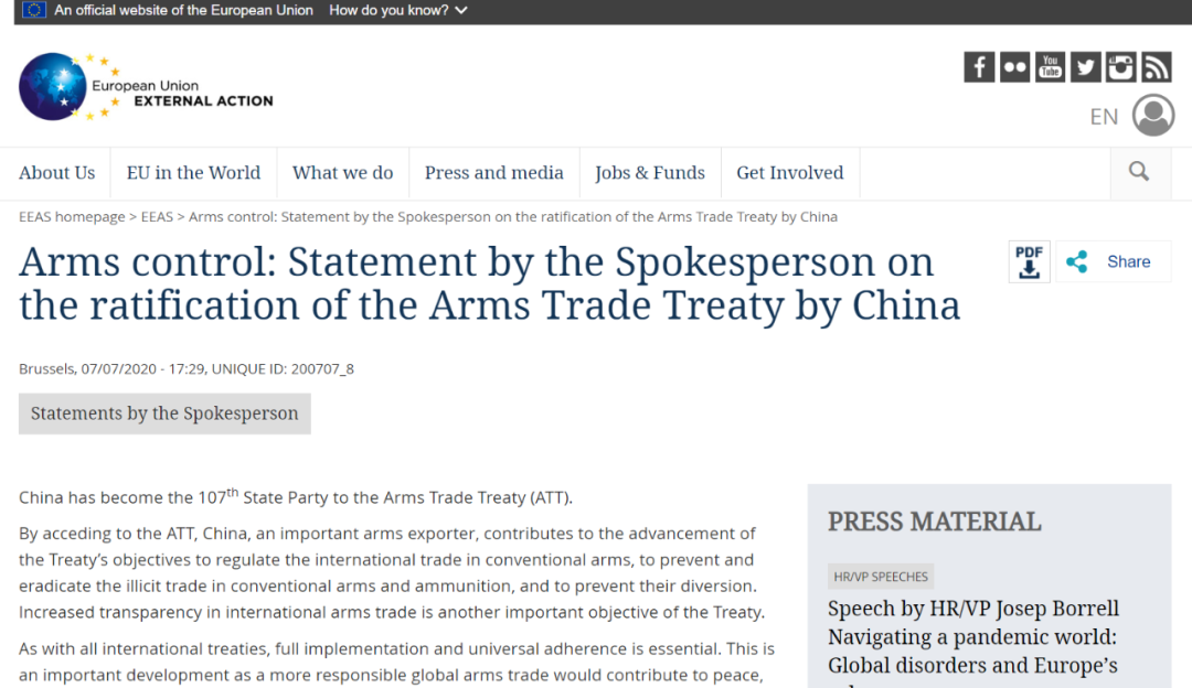 欧洲对外行动署发表声明说:作为一个重要的武器出口国,中国将为规范国际武器贸易、减少并消除非法武器贸易做出贡献