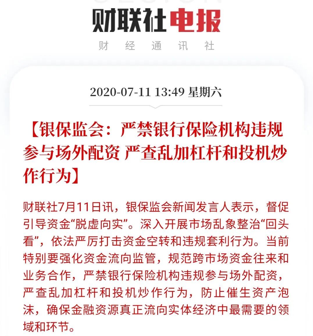 对此,银保监会表示,严禁银行保险机构违规参与场外配资,严查乱加杠杆和投机炒作行为,防止催生资产泡沫,确保金融资源真正流向实体经济中最需要的领域和环节。