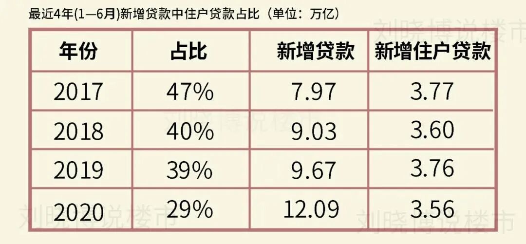 央行数据也证明了这一点:2020年上半年,新增贷款创出新高,但住房贷款在其中的占比却在不断下滑,从前两年的40%以上下降到如今的29%。
