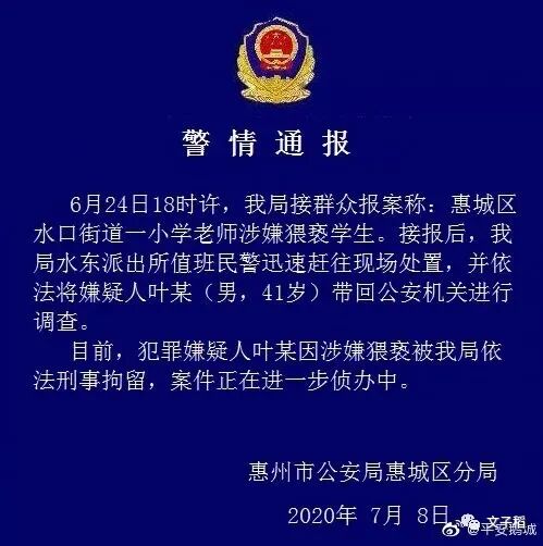 小学生都是幼童,我们不知道案发是哪个年级段,但年龄应该都在10岁以下。根据我国刑法规定,任何与幼童发生性关系的都属强奸!对于伤害儿童的案件,应该本着从重从严的原则,这次怎么是案情较轻的“涉嫌猥亵学生”?难道不知道,猥亵和强奸的案件性质以及量刑是有天差地别的吗?人民警察要为人民,你们体谅过受害孩子以及家长的感受吗?对于这种案件,任何人都别想着大事化小,小事化了,否则就是对受害孩子和家庭的二次伤害。在这一点上,全国的执法机构都应该反思,因为不仅仅是惠州警方存在这方面的问题。